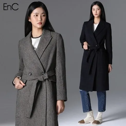 EnC [EnC] 데리 체크 벨티드 울 롱코트