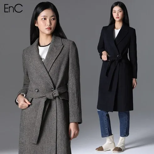 이엔씨 EnC 울블렌디드 체크 벨티드 롱코트